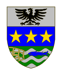 Tiercé en fasce: au I d’argent à l’aigle de sable, au II d’azur à trois étoiles d’or, au III une mer au naturel ou de sinople (ou fascé-ondé de sinople et d’argent) dans laquelle nage un poisson d’azur émaillé d’or, nageant vers un ret au naturel, mouvant du flanc dextre.