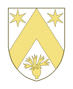 Un chevron, accompagné en chef de deux étoiles à six rais, en pointe d’une fleur d’oeillet.