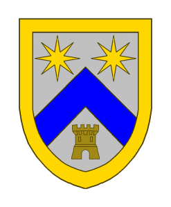 D’argent au chevron d’azur, accompagné en chef de deux étoiles à huit rais d’or, en pointe d’une tour au naturel (posée sur un tertre de sinople, ou non), écu bordé d’or.