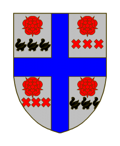 D’argent à la croix d’azur, cantonnée aux I et IV d’une rose de gueules, soutenue de trois merlettes de sable, rangées en pointe, aux II et III d’une rose aussi de gueules soutenue de trois fers de moulin (ou flanchis) aussi de gueules.