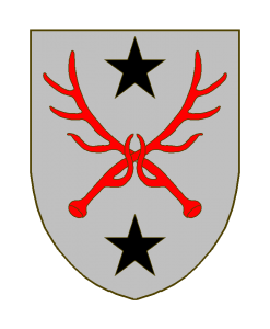 D’argent à deux bois de cerf de gueules passés en sautoir, accompagnés de deux étoiles de sable, l’une en chef, l’autre en pointe (cette dernière parfois renversée).