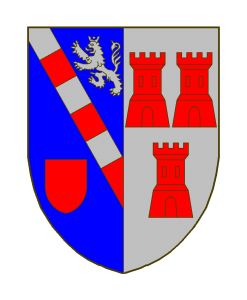 Parti au I d’azur à la bande componée d’argent et de gueules de six pièces, accompagnée en chef d’un lion d’argent, couronné, en pointe d’un écusson de gueules plain, au II d’argent à trois tours de gueules
