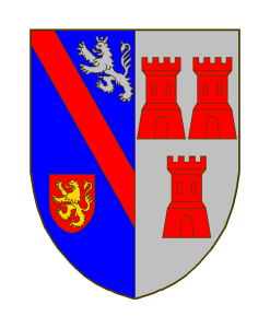 Parti au I d’azur à la bande de gueules, accompagnée en chef d’un lion d’argent, couronné, en pointe d’un écusson de gueules au lion d’or, au II d’argent à trois tours de gueules