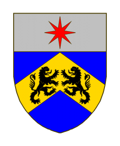 D’azur au chevron d’or chargé de deux lions affrontés de sable, au chef d’argent à une étoile à huit rais de gueules.