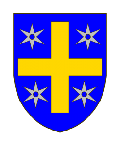 D’azur à la croix alésée d’or, cantonnée de quatre molette d’argent (ou étoiles à 6 rais).
