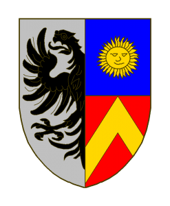Parti, au I d’argent à une demi-aigle éployée de sable, mouvant du parti, au II coupé d’azur au soleil rayonnant d’or, et de gueules au chevron d’or.