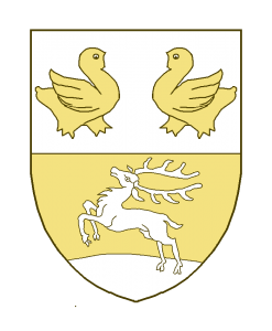Coupé, en chef deux merlettes affrontées, en pointe un cerf élancé, sur une terrasse .