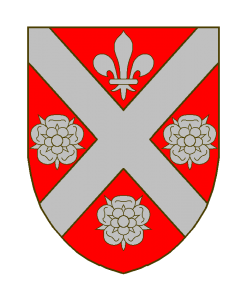 De gueules au sautoir d’argent, accompagné en chef d’une fleur de lis, aux autres cantons d’une rose, le tout du même.