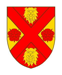 écartelé au sautoir d’or et de gueules, à deux roses du même, boutonnées et sou-tenues d’or, l’une en chef, l’autre en pointe, aux deux flancs chargés chacun d’une tête de léopard arrachée d’or.