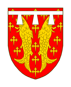 De Salm (en Vosges) [De gueules à deux saumons d’argent, le champ semé de croisettes recroisettées du même.], au lambel en chef.