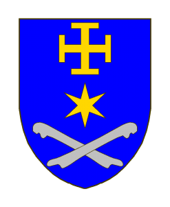 D’azur à une étoile à six rais d’or, accompagnée en chef d’une croisette pattée du même, en pointe de deux tibias en sautoir d’argent.