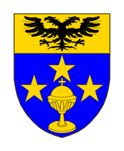 D’azur au ciboire accosté de deux étoiles, et une troisième étoile en chef.