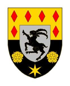 D’argent au bouquetin de sable cabré, à la bordure coupée d’or et d’azur, l’or chargé de six losanges de gueules, l’azur chargé de deux roses d’or, et d’une étoile à six rais du même en pointe.