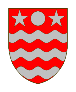 De gueules à trois fasces ondées d’argent accompagnées en chef d’un besant entre deux étoiles du même.