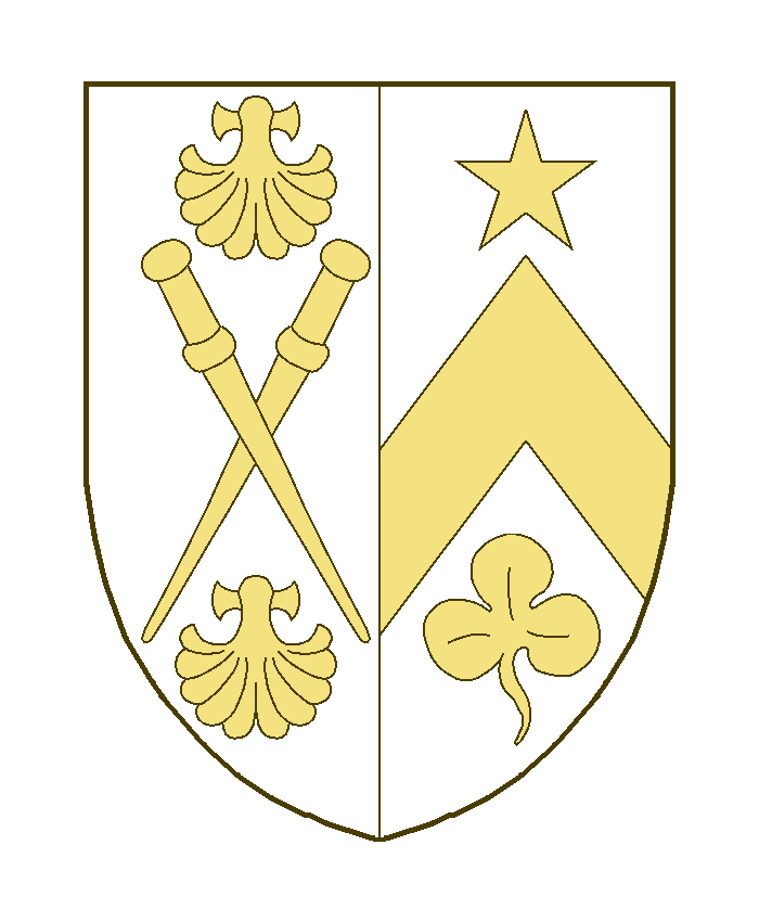 Parti au I deuxbourdons de pèlerin en sautoir, accompagnés de deux coquilles, une en chef, une en pointe, au II un chevron abaissé surmonté d’une étoile, accompagné en pointe d’un trèfle.