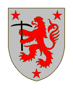 D’argent au lion de gueules, tenant un pic de sable et accompagné de trois étoiles de gueules, deux en chef, une en pointe.