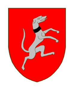 De gueules au lévrier contourné d’argent colleté de sable.