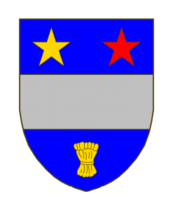 D’azur à la fasce d’argent accompagnée en chef de deux étoiles, celle à dextre d’or, l’autre de gueules, en pointe d’une gerbe d’or.