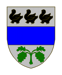 D’argent à la fasce d’azur, accompagnée en chef de trois merlettes de sable, en pointe d’une branche de vigne de deux grappes et deux feuilles de sinople.