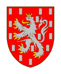De gueules au lion d’argent armé,lampassé et couronné d’or, le champ billeté d’argent.
