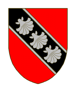 De gueules à la bande de sable bordé d’argent, chargé de trois coquilles du même.