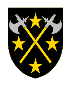 De sable à deux hallebardes d’argent, emmanchées d’or, passées en sautoir, cantonnées de quatre étoiles à cinq rais d’or.