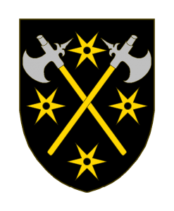 De sable à deux hallebardes d’argent, emmanchées d’or, passées en sautoir, cantonnées de quatre molette d’or.