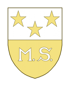 Coupé, en chef trois étoiles posées 2 et 1, en pointe les initiales M. et S.