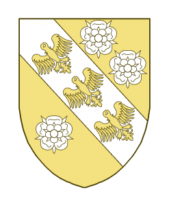 Une bande chargé de trois alérions et accompagnée de trois roses, deux en chef, une en pointe.