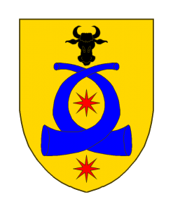 D’or à deux cors de chasse entrelacés d’azur, surmontés d’un rencontre de taureau de sable, accompagnés de deux étoiles à huit rais de gueules, l’une en cœur, l’autre en pointe.