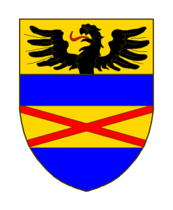 D’azur à la fasce d’or chargé d’un sautoir de gueules, au chef d’or à l’aigle issante de sable, lampassée de gueules.