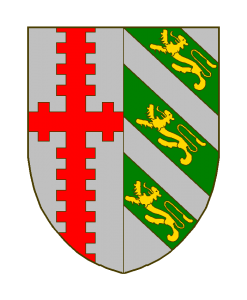 Parti, au I de gueules à la croix bretessée et contre-bretessée d’argent, au II d’argent à trois bandes de sinople, chargées chacune d’un lion passant d’or. (Les dessins montrent la croix simplement bretessée).