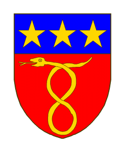 De gueules à un serpent noué et entrelacé d’or, au chef cousu d’azur chargé de trois étoiles à six rais d’or.