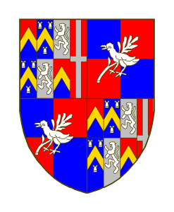 Écartelé: aux I et IV parti de trois traits, les trois premiers coupés, qui font 7 quartiers: aux 1 et 6 coupé en chevron d’azur et de gueules, au chevron d’or brochant, accompagné en chef de deux tours de …, en pointe d’un lion de .. . aux 2 et 4 d’azur au chevron d’or, accompagné de trois tours de …, aux 3 et 5 d’argent au lion de …. Le 7 de gueules à la croix d’argent. Aux II et III contre- écartelé d’azur et de gueules, à un oiseau empiétant un rameau de . . . brochant.
