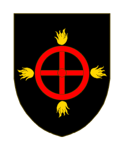 De sable à la roue de quatre jantes de gueules (sic!) posées en croix, accompagnée de quatre flammes d’or, posées en regard des jantes.