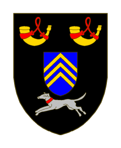 De sable à un écusson d’azur (et non d’argent) à trois chevrons d’or (qui est van Royen), accompagné en chef de deux corne ts aussi d’or, enguiché,s de gueules, et en pointe d’un lévrier courant d’argent acollé de gueules.