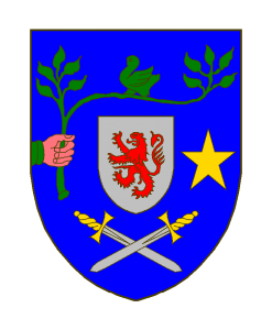 d’azur à l’écusson d’argent chargé d’un lion de gueules, accompagné à dextre d’une main de carnation (vêtue, mouvant du flanc) tenant une branche de laurier montant et passant en fasce au-dessus de l’écusson, sur laquelle est perchée une merlette au point du chef, le tout de sinople, accompagné à sénestre d’une étoile d’or, et en pointe de deux épées d’argent garnies d’or, en sautoir, les pointes en bas.