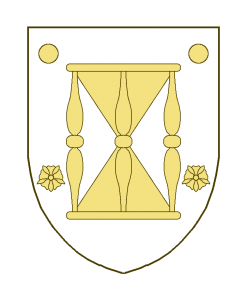 Un sablier, accosté en chef de deux petits besants ou tourteaux, en pointe de deux petitesquintefeuilles.