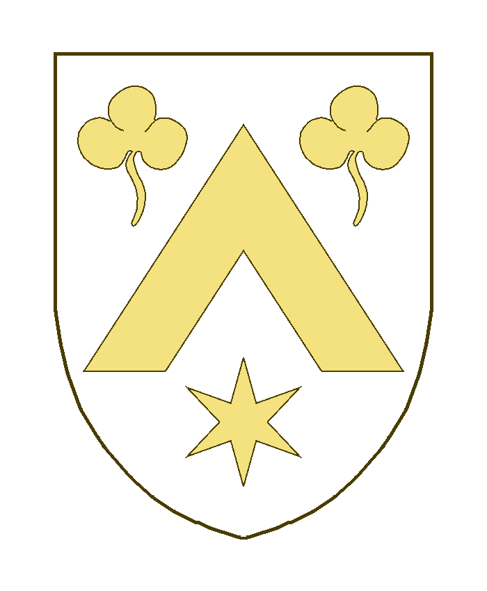Un chevron alésé, accompagné en chef de deux trèfles, en pointe d’une étoile à six rais.