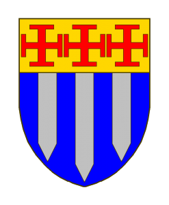 d’azur à trois pals d’argent, les pieds aiguisés, au chef d’or chargé de trois croix potencées de gueules.