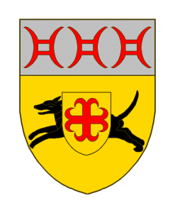 D’or au lévrier courant de sable, au chef d’argent chargé de trois fers de moulin de gueules, et sur le tout un écusson d’or à la croix ancrée de gueules.