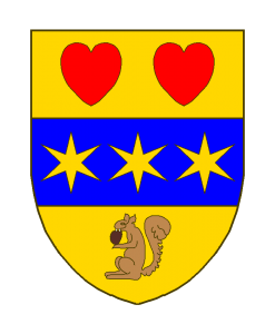 D’or à la fasce d’azur chargé de trois étoiles à six rais d’or, accompagnée en chef de deux coeurs de gueules, en pointe d’un écureuil au naturel mangeant une noisette, (assis sur une terrasse de sinople).