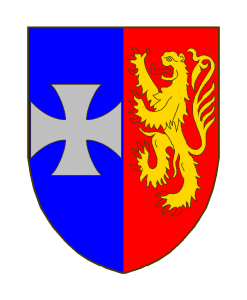 Parti au I d’azur à la croix pattée alésée d’argent, au II de gueules au lion d’or, armé et lampassé du champ.