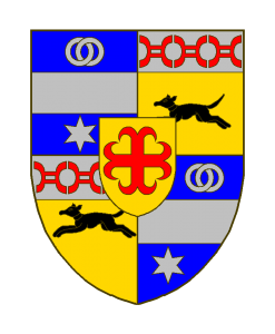 Écartelé: aux I et IV d’azur à la fasce d’argent, accompagnée en chef de deux annelets entrelacés du même, en pointe d’une étoile à six rais aussi d’argent, aux II et III d’or au lévrier courant de sable, au chef d’argent chargé de trois fers de moulin de gueules, et sur le tout d’or à la croix ancrée de gueules.