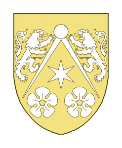 Un compas posé en chevron, à deux lions affrontés grimpant sur les branches du compas, accompagné en pointe de deux quintefeuilles surmontées d’une étoile à six rais (ou molette).