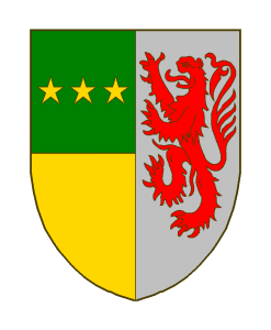 Parti, au I coupé de sinople à trois étoiles rangées d’or. en pointe, d’or plain, au II d’argent au lion de gueules.