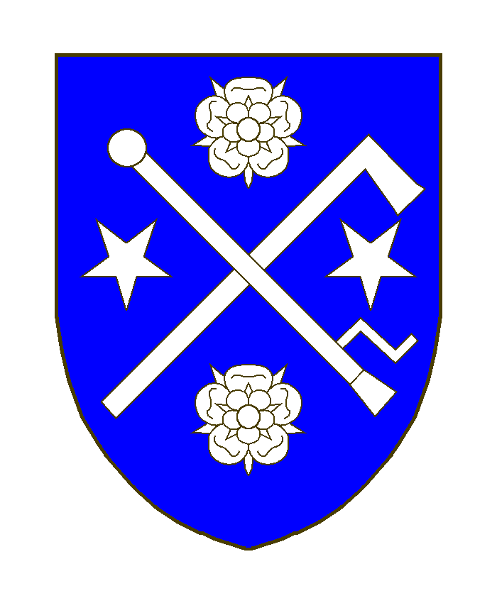 D’azur à deux outils (voir dessin) en sautoir, accompagnés de deux roses, une en chef, une en pointe, et de deux étoiles renversées aux flancs.