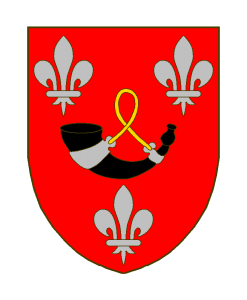 De gueules au cor de chasse de sable, virolé d’argent, lié d’or, accompagné de trois fleurs de lis d’argent, deux en chef, une en pointe.