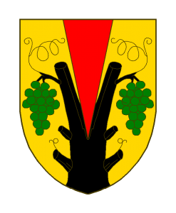 D’or au cep de vigne vrillé et écoté de sable, fruité de sinople, mouvant de la pointe, fendu par une pile de gueules mouvant du chef.