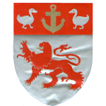 au chef de gueules chargé d’un ancre d’or posé en pal, accosté de deux cannettes affrontées d’argent.